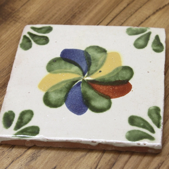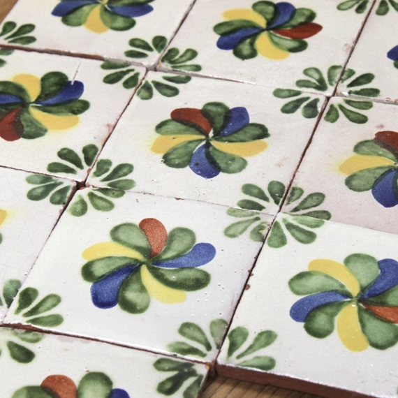 品名:焼きタイル メキシカンフラワー サイズ:105×105(1枚のサイズ) 在庫数:25枚 ※表示価格は1枚のレンタル料です。